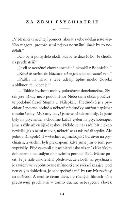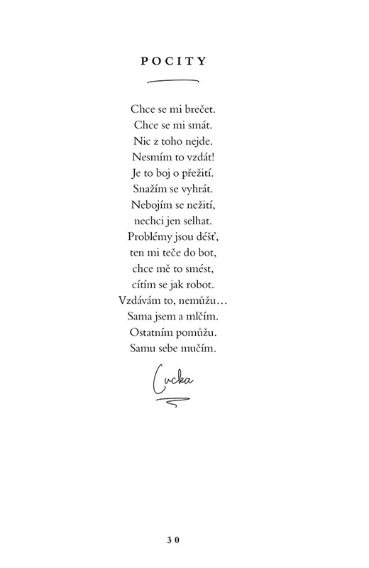 Tato básnická sbírka představuje prožívání lidí s psychickým onemocněním, reálně a bez příkras, a je doplněna o komentáře odborníků. Obsahuje básně psané během hospitalizace i doma, najdeš zde smutné básně protkané slzami, psané v náročném období, ale i básně vzniklé ve světlejších okamžicích našich životů, které ti na tváři vykouzlí úsměv. Kniha ti umožní nahlédnout do našich životů se všemi vzestupy a pády, jak tomu i v běžném životě bývá. Čekají na tebe řádky plné té nejčernější temnoty, ale i prosakujícího světla naděje a radostných chvil.