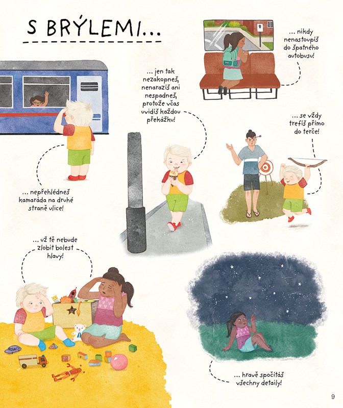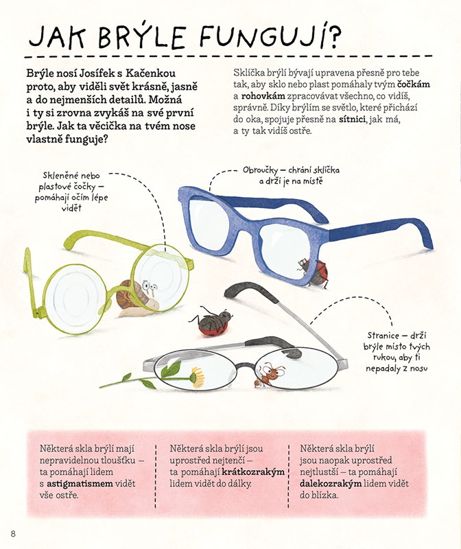 Kačenka a Josífek nosí brýle a díky tomu vidí svět krásně, jasně a do nejmenších detailů. Možná i ty si zrovna zvykáš na svoje první brýle a zatím nevíš, co si o té podivné věcičce na nose vlastně myslet. Bude opravdu tak užitečná, jak tvrdí dospělí? Přestane ti vůbec někdy na obličeji překážet? A co když se ti budou ostatní děti smát? Věř mi: s brýlemi se ti bude žít skvěle! V této knize se o své nové pomůcce dozvíš všechno, co tě kdy zajímalo: jak funguje zrak, jak lékař pozná, že špatně vidíš, kdo vynalezl první brýle a jak vypadaly, co budou umět brýle budoucnosti, které slavné osobnosti nosily brýle a mnohem víc. Seznam se s bohatým světem brýlí a staň se jejich hrdým majitelem!