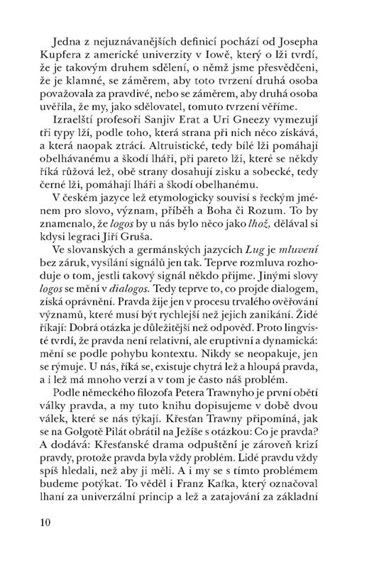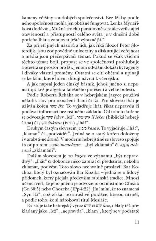 Karel Hvížďala vede s vrchním zemským rabínem Karolem Efraimem Sidonem dialog bezmála třicet let a zrodily se z toho čtyři knihy. Toto je pátá. A když si pánové uvědomili, že díky internetu, sociálním sítím a algoritmům ve veřejném prostoru nad informacemi převážila lež, fakenews, blábol či spiklenecké teorie, rozhodli se, že poslední knihu věnují celou jen jednomu slovu, a to je právě LEŽ. Jedna z nejuznávanějších definicí lži pochází od Josepha Kupfera z americké univerzity v Iowě, který tvrdí, že lež je takovým druhem sdělení, o němž jsme přesvědčeni, že je klamné, se záměrem, aby toto tvrzení druhá osoba považovala za pravdivé, nebo se záměrem, aby druhá osoba uvěřila, že my, jako sdělovatel, tomuto tvrzení věříme. V hebrejštině existuje výrazů označujících lež hned několik: šeker, šav, achzava. I o nich a bilických lžích si bude Karel Hvížďala s rabínem karolem Sidonem povídat.
