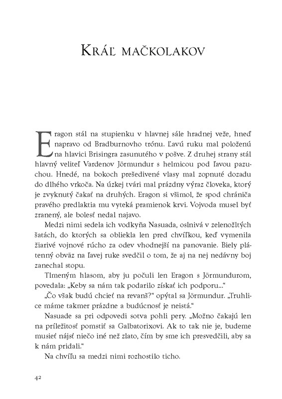 Nie je to tak dávno, čo bol Dračí jazdec Eragon obyčajný chudobný farmársky chlapec a jeho dračica Zafira iba modrý kameň v lese. Teraz však práve od nich závisí osud celého sveta! Dlhé mesiace výcviku a bojov priniesli mnohé víťazstvá a nádej, ale aj srdcervúce straty. Jazdec a jeho drak došli ďalej, než sa odvážil ktokoľvek iný. Lenže tá najťažšia bitka ich ešte len čaká. Musia sa postaviť samotnému Galbatorixovi. Pokiaľ to nedokážu oni, neporazí ho nik. Druhá šanca neexistuje.
