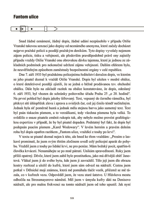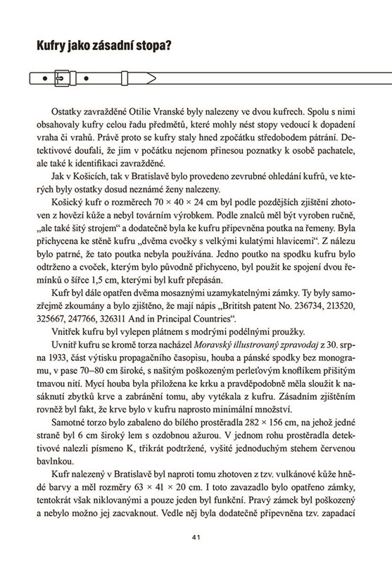 Pátrání po vrahovi Otilie Vranské nabízí pohled do složitého vyšetřování jednoho z nejzáhadnějších kriminálních případů v Československu. Autor, ředitel Muzea policie, se podrobně zabývá případem slovenské prostitutky Otilie, jejíž rozčtvrcené tělo bylo v roce 1933 odesláno ve dvou kufrech vlakem do Bratislavy a do Košic. Po letech pečlivého zkoumání policejních záznamů, dopisů a DNA, Galaš přináší nový pohled na tento dlouho nevyřešený zločin. Kniha vypráví o jeho jedenáctiletém vyšetřování, které vede k odhalení šokujících rozporů a možného řešení této záhady. Připojte se k objevování nových informací v jednom z nejzapeklitějších kriminálních případů, který dodnes budí zájem a spekulace.
