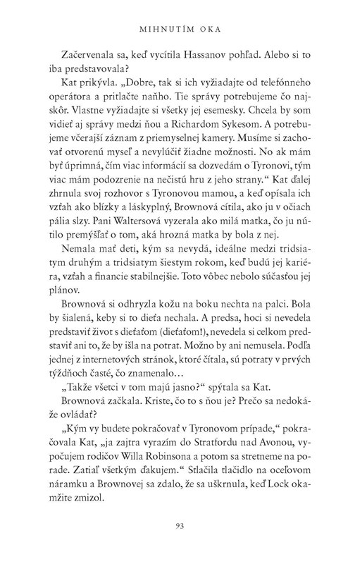 Mihnutím oka je prvý diel detektívnej série, kde hlavným vyšetrovateľom je Kat, ktorá ma nezvyčajného pomocníka, umelú inteligenciu s menom Lock. Kat dostane za úlohu otvoriť odložené prípady nezvestných osôb, no podmienkou je, že musí vyskúšať spolupracovať s Lockom. Otázkou je, či si umelá inteligencia poradí lepšie ako človek, či fakty zvíťazia nad inštinktom a či je vôbec možné aby človek spol...