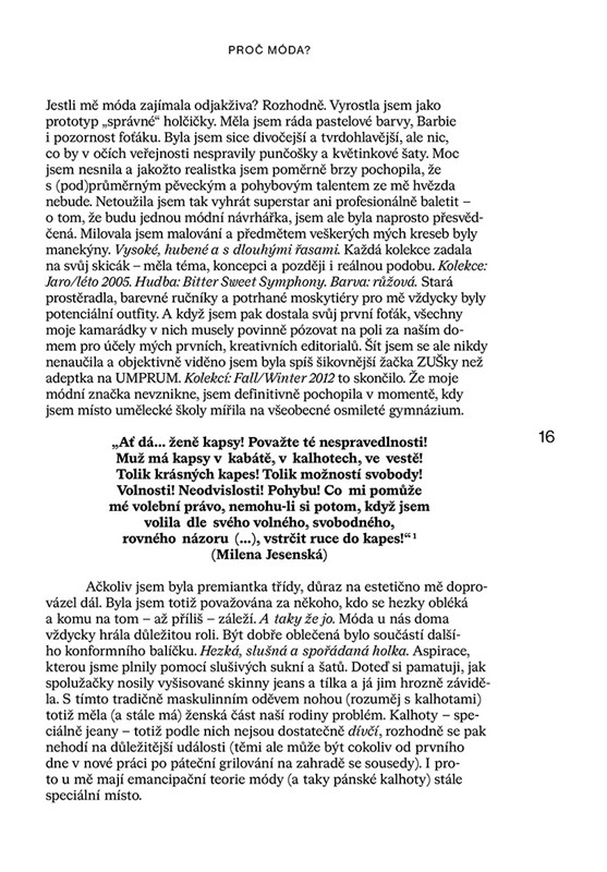 Je móda povrchní a toxická? Rozhodně! Myslela jsem si s nezdravou neochvějností ještě nedávno. Nedařilo se mi jí ale utéct – objevovala se v podobě pláště pevně svírajícího něco tak intimního jako moje vlastní tělo, ale i v debatách, které jsem vedla o politice, práci, feminismu, ekologii nebo byznysu... V knize On fashion: O (bez)významnosti módy jsem proto tyto otázky s „jasnou“ odpovědí otevřela znovu. Proč móda? Je povrchní? Nebezpečná? Je to sen? A je vůbec možné na tyto otázky jednoznačně odpovědět? Prozradím to hned – není. Za pomocí odborné expertizy, ale i osobních zkušeností deseti významných osobností se nám ovšem podařilo vytvořit velmi široký a barevný obraz tohoto zásadního společenského fenoménu, který už stovky let ovlivňuje dennodenně lidský život. Estetička a historička Jana Máchalová, ekonomka a politička Danuše Nerudová, modelka Barbora Černá, environmentální aktivistka Natália Pažická nebo módní návrhář Jan Černý. Nejen oni v knize promluvili o tom, co pro ně móda znamená. Příběh o tom, jak opojný ale i drsný pro mě osobně módní průmysl byl, otevřu i skrze svou vlastní perspektivu – otevřeně a bez filtru.