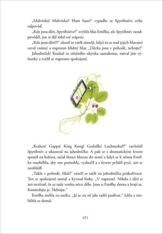 Toho rána, kdy začíná náš příběh, se Emilce stala zvláštní věc: potkala na chodbě školy dítě, které neznala. A další den zase! A pak ještě jednou! A pak znovu! Ve škole se prostě začaly objevovat cizí děti v prapodivných ohozech, tu s dudlíkem v puse, tu s kojeneckou lahví, s jednookým kotětem ve výstřihu, s tankistickou helmou na hlavě nebo prskavkami v uších. A pokaždé, když se na ty prapodivné děti Emilka zaměřila, zmizely. A když říkám „zmizely“, myslím tím, že opravdu zmizely. Vždycky to prostě udělalo „plomp!“ – a děti byly pryč!