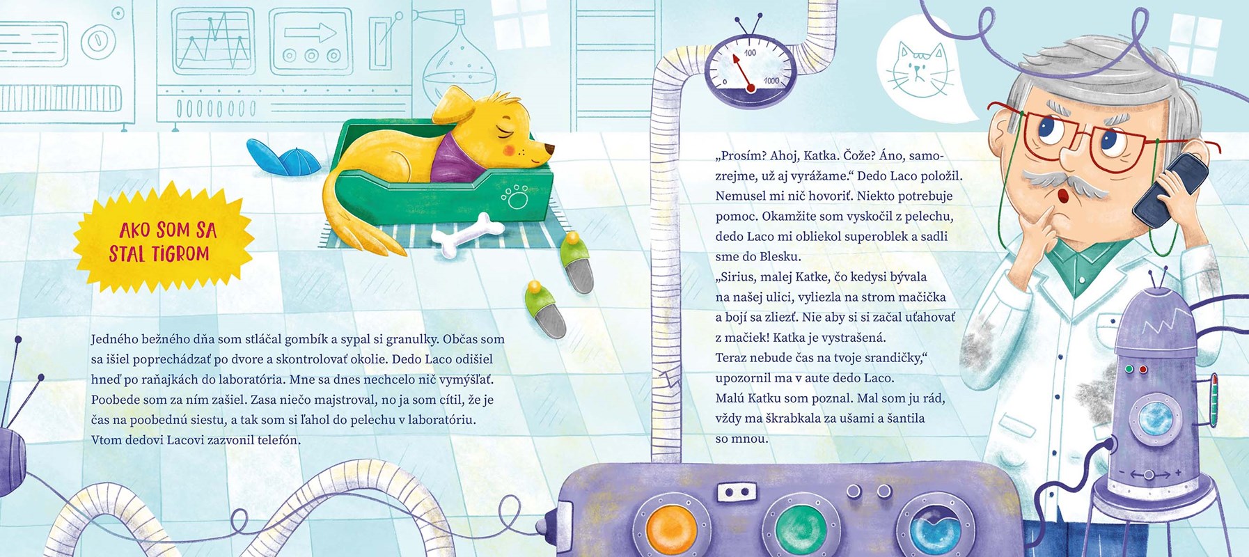 Môj dvojnohý majiteľ, priateľ na celý život a superhrdinský kolega, je dedo Laco. Nie je to však obyčajný dedo, ktorý lúšti krížovky. Dedo Laco je vynálezca. Spolu ochraňujeme naše mestečko a máme veru viac záchranných akcií, ako mi pri pĺznutí vypadne chlpov.