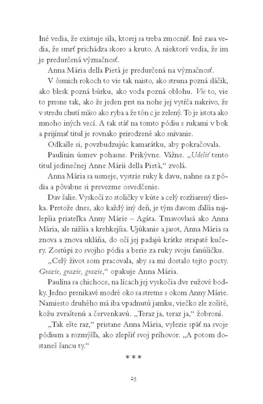 Úžasný román o hudbe, opojení a o zrade, inšpirovaný skutočným príbehom Anny Márie della Pietá, benátskej siroty a husľového zázračného dieťaťa. Študovala u Antonia Vivaldiho a napokon sa stala hviezdnou hudobníčkou a jeho najväčšou múzou.