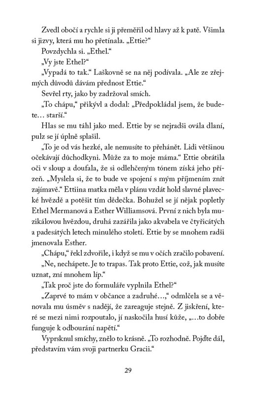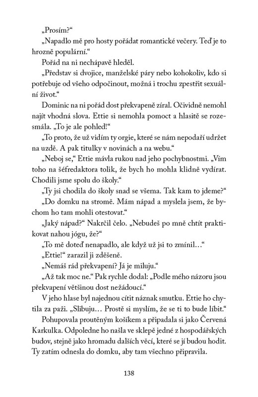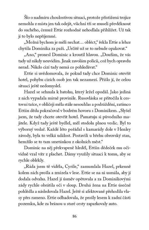 Když smolařce Ettie nevyjde kariéra v Londýně, vrací se do Yorkshiru, kde na ni čeká pokušení v podobě jezera ve zdánlivě opuštěném zámeckém parku. To se ovšem nachází na soukromém pozemku, jehož majitel nadšené sportovce vyhání. Dominik lpí na dodržování pravidel a spontánní Ettie ho musí jako jeho podřízená, která mu pomáhá vybudovat hotel, respektovat. Ale chladivá hladina v parném létě přitahuje nejen ji. Jezero je jedinečným místem pro nová přátelství. A možná i pro lásku. Nikdo by totiž neměl plavat sám.