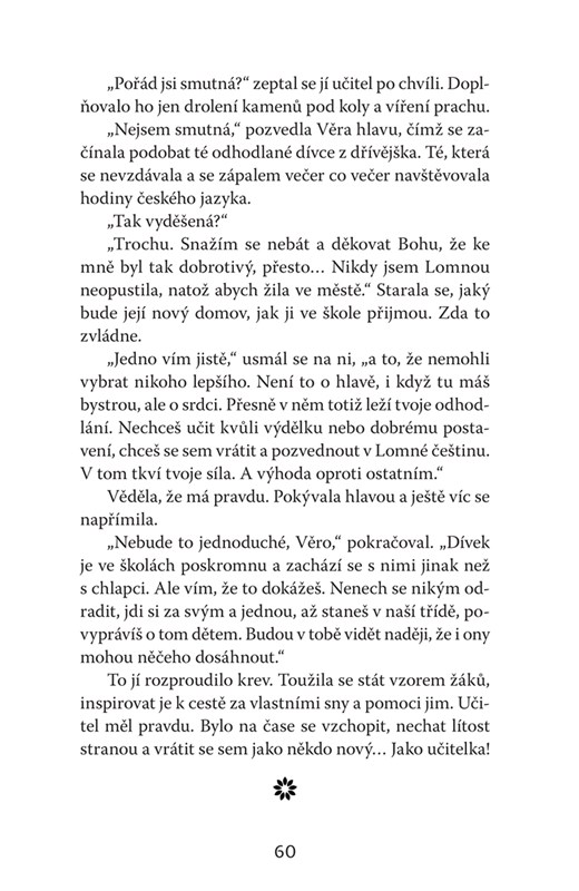 Miriam Blahová opět vypráví příběh plný emocí ve dvou časových rovinách. Vrací se do obce Horní Lomná a tentokrát zachycuje její vývoj v první polovině dvacátého století. Hlavní hrdinka Věra prožívá nejen společenské a politické změny, ale také milostný příběh. Život v česko-polském pohraničí je plný nástrah. Tím spíše pro ambiciózní ženu, která má na svou dobu velmi pokrokové myšlenky. Ráda by totiž vzdělávala děti, ale sousedé mají o údělu ženy jiné představy. V současné dějové lince hledá v Horní Lomné útočiště její pravnučka Anna. Když se její manželství ocitá v krizi, nachází útěchu v mateřídoušce, která její myšlenky zavede do historie. I když Annu a Věru od sebe dělí celé století, obě hledají svůj úděl a především lásku, kvůli které je potřeba mnohé obětovat.