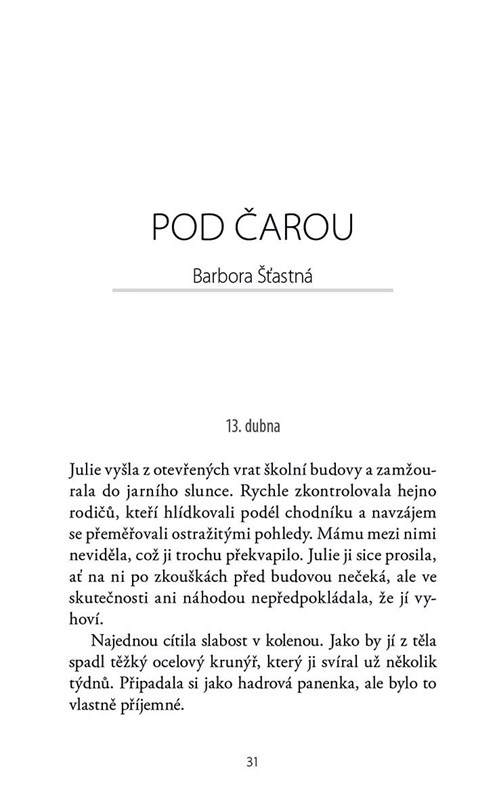 Michaela Klevisová, Jana Poncarová, Barbora Šťastná, Petra Klabouchová, Scarlett Wilková a další skvělé spisovatelky pro vás připravily pestrou mozaiku originálních příběhů. Prožijete s nimi osud italské uprchlice a českého mladíka za první světové války, vražedný thriller o přijímačkách na střední školy, vtipnou sci-fi o dokonalých robomanželkách, psychologický horor o hlubinách mateřské duše nebo ironický příběh z kurzů pro skutečné muže. Nakladatelství Motto se může pochlubit silnou sestavou autorek, které se poprvé setkaly v jedné knize a v žánru považovaném za královskou literární disciplínu.