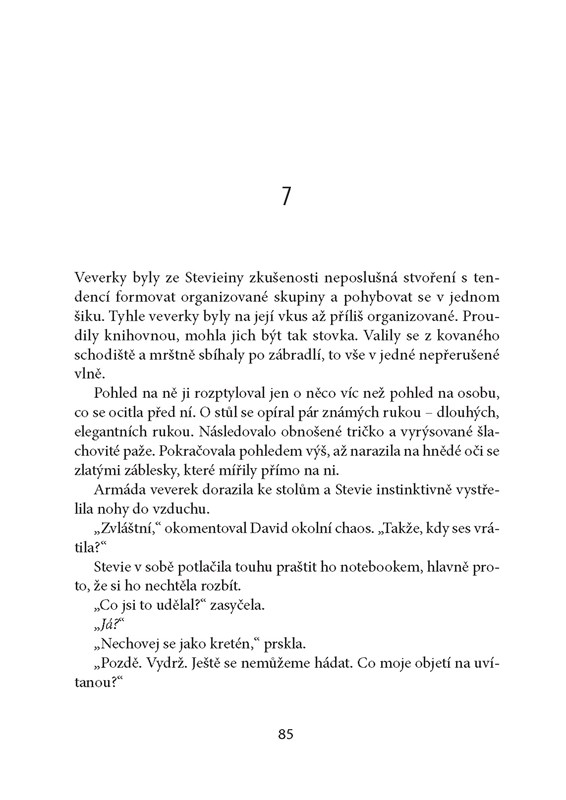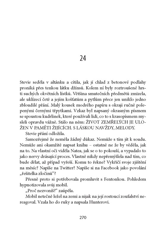 Stevie toužila rozlousknout ellinghamskou záhadu, ale místo toho našla svého spolužáka mrtvého. A zločiny z minulosti stále číhají v temnotě. Zrovna když si začne dávat jedna a jedna dohromady, její rodiče se rozhodnou, že ji ze školy odvezou. Když teď není v akademii plné tajných chodeb a podivných přátel, začíná ztrácet kontakt se zbytkem světa. Aspoň už neuvidí Davida. Davida, kterého políbila. Davida, který jí lhal o své identitě. Pak ovšem k ní domů dorazí Davidův otec, nenáviděný politik King, a navrhne jí dohodu: Dostane Stevie zpátky na Ellinghamovu akademii. Na oplátku musí být na Davida hodná. Tajemství za Ellinghamskými vraždami stále čeká na vyřešení a Stevie ví, že je blízko. Ale cesta za pravdou má víc zákrut a obratů, než si dovedla představit. A svým odhalením může ublížit někomu, na kom jí záleží.