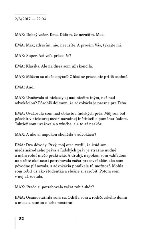 Hlavná hrdinka Ema pracuje vo významnej londýnskej advokátskej kancelárii. Vysoké pracovné nároky sa výrazne podpisujú na jej schopnosti nadviazať a udržať zdravé vzťahy. Čakajú ju veľké životné zmeny: nová pracovná méta – partnerstvo vo firme – a zároveň návrat domov, do Bratislavy. V tomto náročnom období jej do života vstúpi Max – mladý muž, ktorý ju nesmierne obdivuje. Spočiatku nevinný vzťah vo virtuálnej realite naberá na intenzite. Dokáže sa Ema presadiť medzi mužskými kolegami a ustáť hry firemnej internej politiky? Nájde v sebe silu vymaniť sa zo škodlivého prostredia a spod vplyvu ľudí, s ktorými sa necíti dobre?