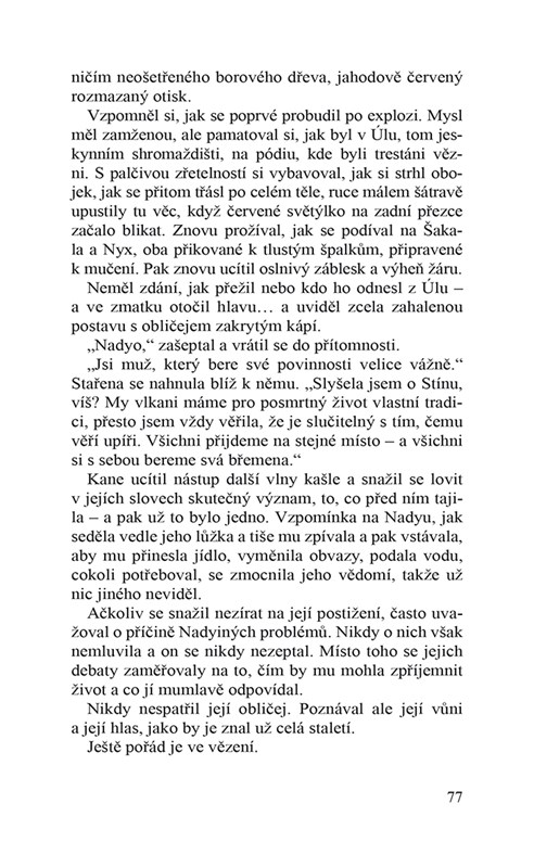 Kane, nespravedlivě obviněný ze surové vraždy své shellan, je odsouzen k pobytu v obávaném vězeňském táboře – aniž zná temnou pravdu o svém domluveném sňatku. O stovky let později, děsivě popálený při pokusu o záchranu ostatních, se modlí, aby se už konečně mohl shledat ve Stínu se svou družkou… a neví, jaká odhalení ho čekají. Nadya je ošetřovatelka, která dělá, co může, aby zmírnila utrpení vězňů. Když se v její péči ocitne Kane, nemůže se nevcítit do jeho stavu z velice osobních důvodů – a když ho stráže naposled odvlečou, obává se, že ho čeká strašlivá smrt.