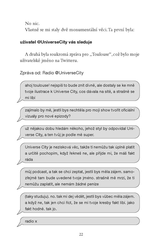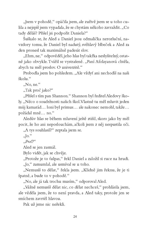 Frances je pilná studentka a nikdo a nic jí nesmí stát v cestě na vysněnou univerzitu. Ani přátelé, vina nebo tajemství – dokonce ani to, kým ve skutečnosti je. Pak ale díky jednomu podcastu potká Aleda a poprvé v životě se nebojí být sama sebou. Když se křehká důvěra mezi nimi rozpadne, Frances se najednou potácí mezi tím, kým byla, a tím, kým se touží stát. A pochopí, že se musí postavit své minulosti. Přiznat, proč zmizela její kamarádka a Aledova sestra Carys. K tomu ale bude Frances potřebovat veškerou odvahu, kterou v sobě dokáže najít.