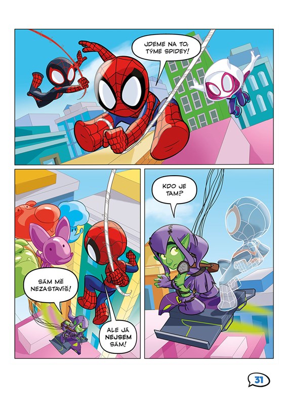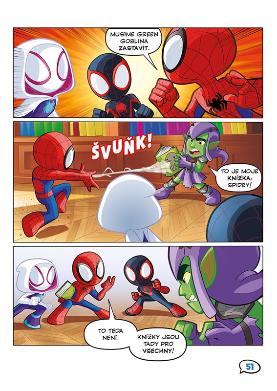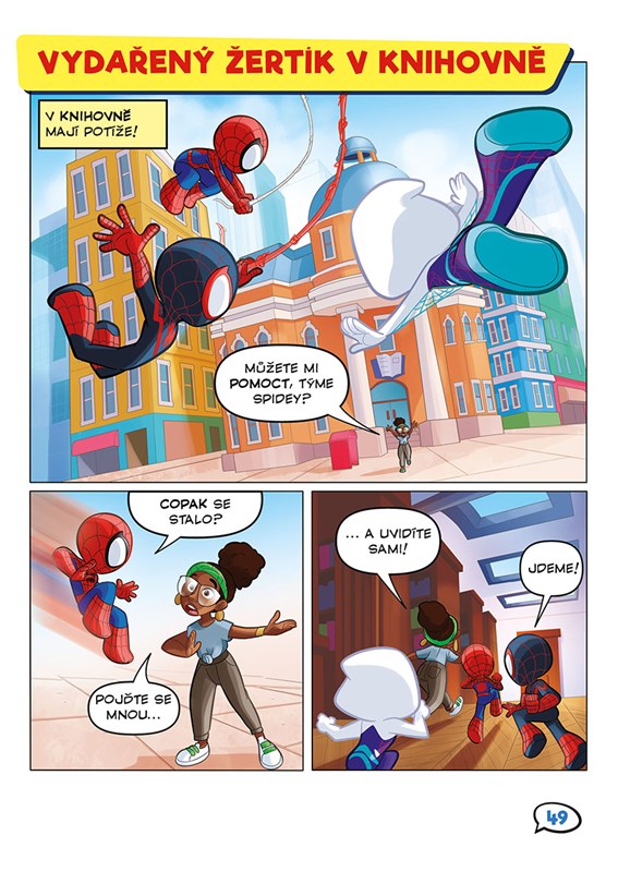Oblíbení pavoučí hrdinové Spidey, Ghost-Spider a Spin už sviští do akce v komiksové knížce plné úžas...