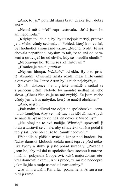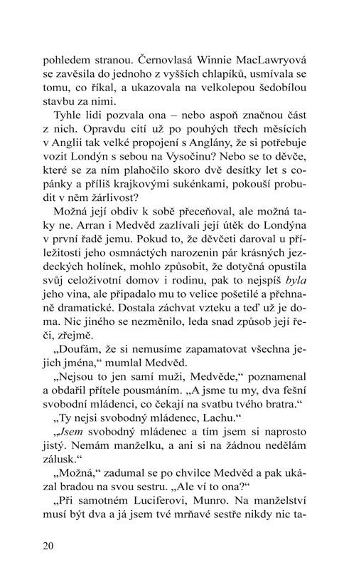Drsný a pohledný Lachlan se vůbec nepodobá anglickým uhlazeným aristokratům, kteří se o Winnie zajímali v Londýně. Tři měsíce odloučení stačily víc než dost, aby poznala svět o mnoho nádhernější než nezkrotná skotská divočina - a objekt její dětské lásky. Když se teď ale rozhodla najít si o trochu civilizovanějšího budoucího manžela, dokáže Lachlan ocenit její kouzlo? A existuje pro ni aspoň malá možnost ignorovat to, jak zběsile ji přitahuje?