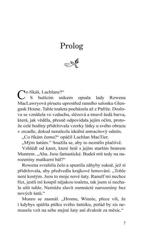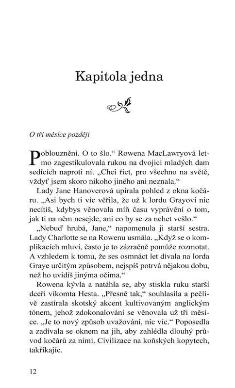 Temperamentní Rowena MacLawryová se vrací na Skotskou vysočinu po pozoruhodně úspěšném debutu v londýnské společnosti a dává zcela jasně najevo, že ze svého dětského poblouznění Lachlanem MacTierem už vyrostla. Jemu to vyhovuje, protože stejně neměl nikdy v úmyslu se s ní oženit. Najednou ale nemůže dál ignorovat skutečnost, že z někdejší neohrabané uličnice Winnie vyrostla velmi elegantní - a nadmíru žádoucí - mladá žena…