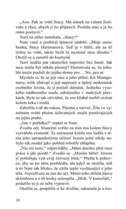 Když se ovšem jednoho dne vrátí domů z krátké pracovní cesty a objeví ve svém domě u jezera pohledného cizince, zavětří něco nekalého. Někdo si tu hraje na dohazovače a Terri musí přiznat, že Nate Taggert je přesně její typ. Jenomže je zároveň zasnoubený s dcerou starosty a naprosto nedostupný.