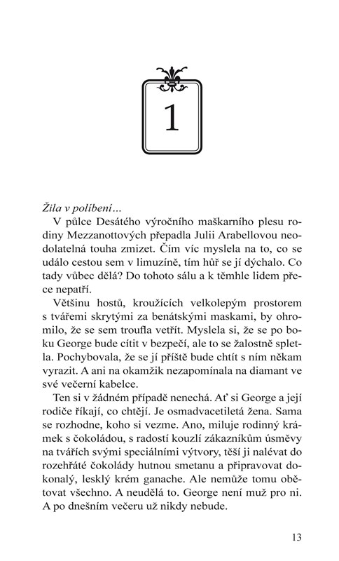 Už od dob, kdy se jako malá dívenka učila vyrábět bonbony v rodinné dílně, věděla Julie Arabellová o nepřátelství mezi klany Arabellů a Mezzanottů. Ač se jejich krámky nacházely na jedné ulici, pyšní konkurenti z obou rodin se sobě navzájem vyhýbali jako čert kříži. Až do onoho večera, kdy se Julie na maškarním plese setkala s pohledným neznámým a propadla jeho kouzlu. A ke své hrůze zjistila, že záhadný muž nese zapovězené příjmení Mezzanotte!