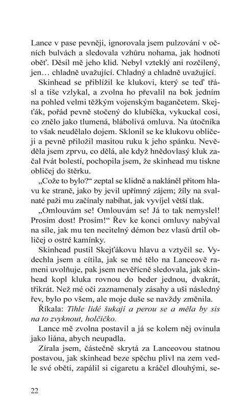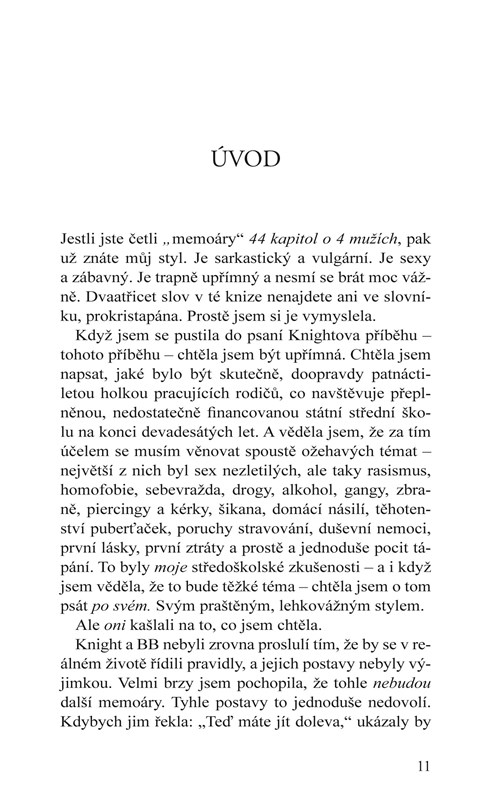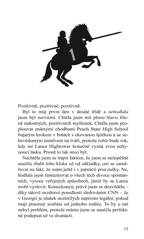 Já měla naopak ráda každého… až na Knighta. Abych řekla pravdu, byla jsem z něj podělaná strachy. Jediné, po čem jsem toužila, bylo provdat se za Lance Hightowera, který vypadal jako princ z pohádky a byl králem punkové scény školy Peach State High, a mít s ním kupu dětí.