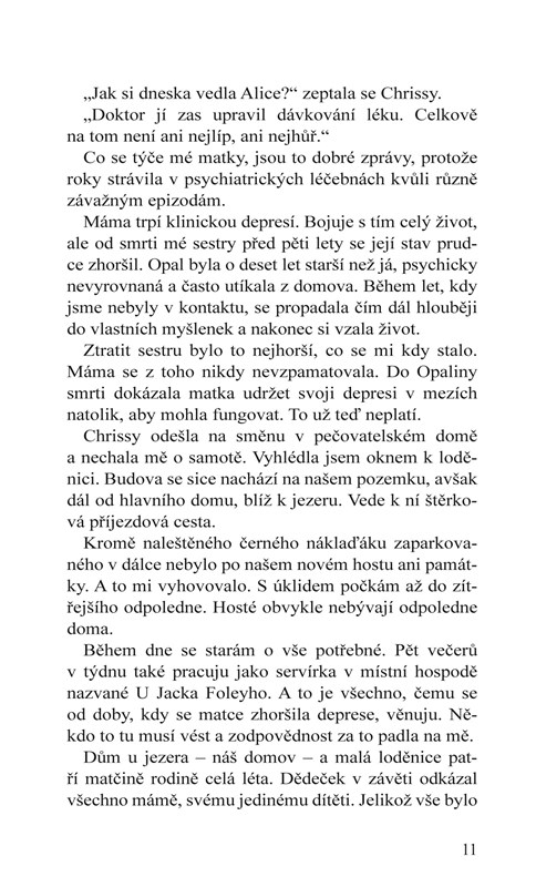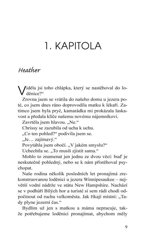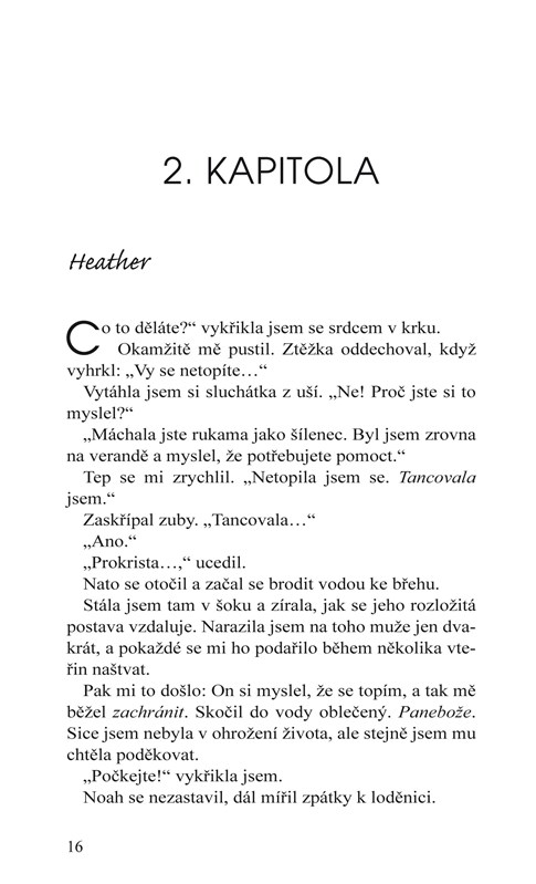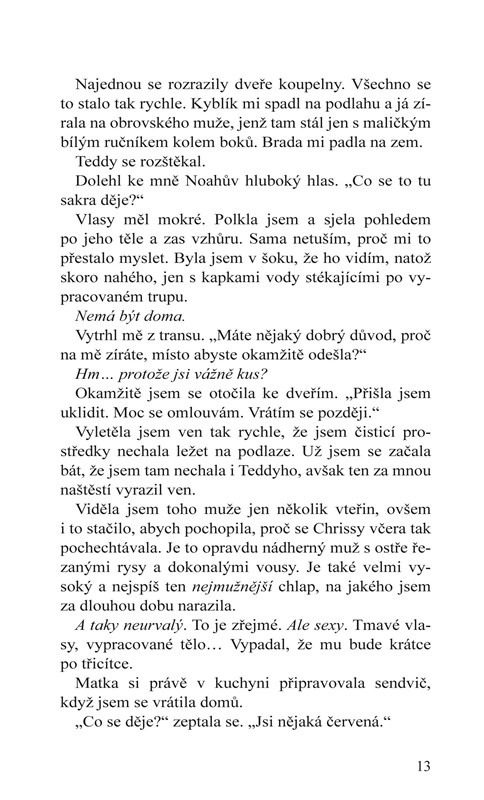 Pohledný a tajuplný Noah je pro mě zapovězený. Vím, že tu nezůstane natrvalo. Vím, že je pro mě nejspíš moc starý. A přesto mě přitahuje. Navíc se mě pokusil zachránit, když se mylně domníval, že se topím. Dala jsem mu najevo, že ho chci. A on mě před sebou varoval. Začali jsme si po nocích povídat na břehu jezera. Naše přátelství se však brzy změnilo v něco, z čeho se možná nikdy nevzpamatuju.