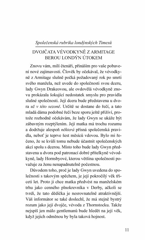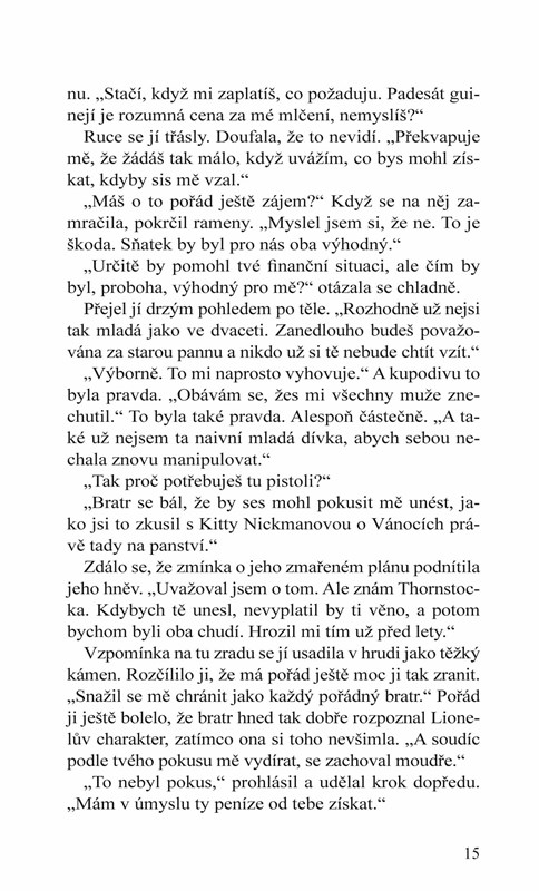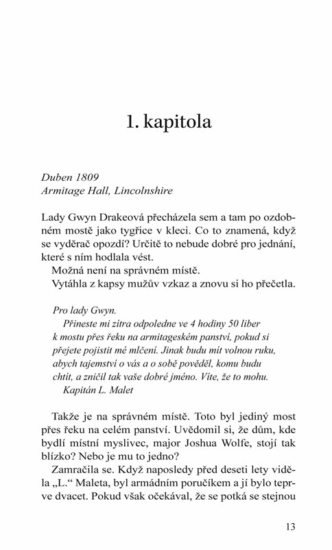 To se však změní, když ho její bratr, vévoda z Thornstocku, zaměstná jako osobního strážce, který má na ni dávat pozor během jejího společenského debutu v londýnské vyšší společnosti. Lady Gwyn totiž zřejmě ohrožuje její bývalý ctitel kapitán Malet, který si už kdysi nechal zaplatit za to, že se jí vzdá, ale při trvalém nedostatku peněz znovu uvažuje o tom, jak by ji mohl využít pro své nekalé účely.