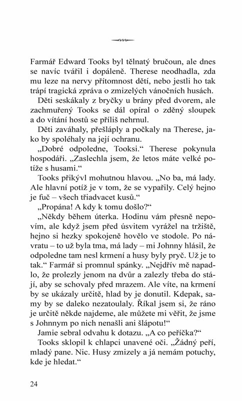 "Po smrti manžela lady Therese Osbaldestoneová strávila tři roky na cestách, až se nakonec rozhodla usadit na venkovském sídle Little Moseley v Hampshire. Ještě si sama nebyla jistá, zda se po smrti manžela diplomata a po životě plném vzrušení a zážitků rozhodla správně a nebude se mezi vesnickou komunitou nudit, když se jí na prahu objevila trojice malých vnoučat; dcera jí je svěřila do péče po dobu, než se uzdraví jejich otec. Therese se ocitla před náročným úkolem: děti dorazily bez vychovatelky a ona sama byla sice milující matka, ale o její vlastní děti se vždy staraly zástupy chův a domácích učitelů. Nebyla si jistá, jak děti zabavit, aby se jim nestýskalo a navíc aby si na pobyt u urozené babičky odnesly milé vzpomínky. Shodou okolností se ve vesnici záhadně ztratilo početné husí hejno, jež mělo všem místním rodinám zajistit vánoční hostinu. Vánoce bez husy byly nepřijatelná představa pro všechny, proto se Therese rozhodla zapojit děti do pátrání po osudu hejna.