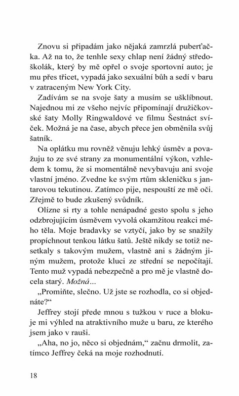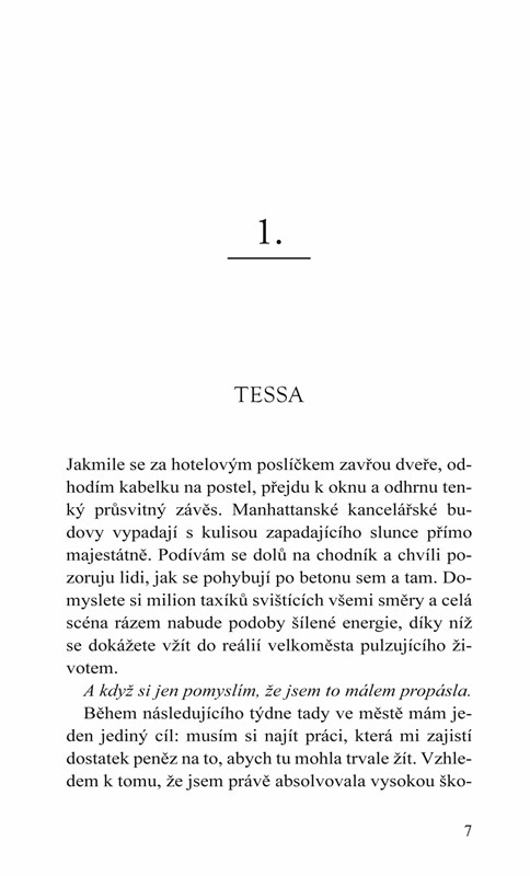 Přistála jsem v New Yorku s životopisem v ruce a odhodláním přijít konečně o panenství. Jsem rozhodnutá vzít jakoukoli práci. Co se však týká toho druhého, nespokojím se s ničím menším než s osudovou přitažlivostí a vroucí vášní, a tímhle spínačem zatím ještě nikdo neotočil.