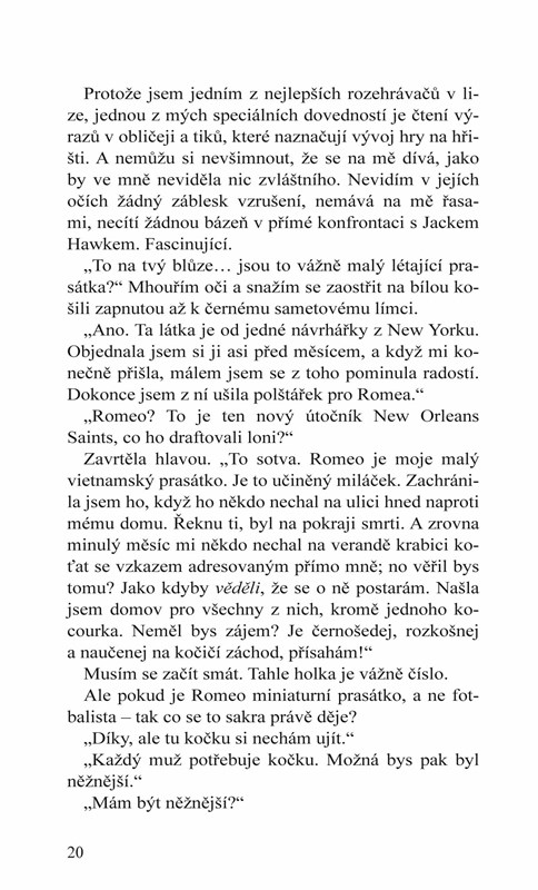 Další den ráno se dozvídám, že je to Jack Hawke – profesionální rozehrávač a „zlý chlapec“ s temnou minulostí. Když mi dává podepsat prohlášení o mlčenlivosti, je to pro mě varováním, že tenhle chlap rozhodně není nic pro mě. Podepisuji se jako Julie Kapuletová a čekám, že tím to mezi námi končí. Proč by měl slavný fotbalista s ocelovými svaly hledat knihovnici z malého města?