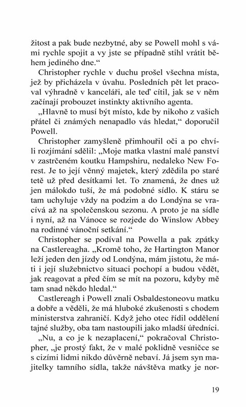 Jediný syn lady Osbaldestoneové jako vysoký funkcionář ministerstva pro zpravodajství a výzkum dostal oficiální příkaz zmizet veřejnosti z očí, dokud jeho nadřízení nevyřeší problém s francouzským agentem, jenž ho špehoval v Londýně. Vesnička Little Moseley mu připadala jako skvělý úkryt, kde on ani jeho ochranka žádné potíže nečekali.