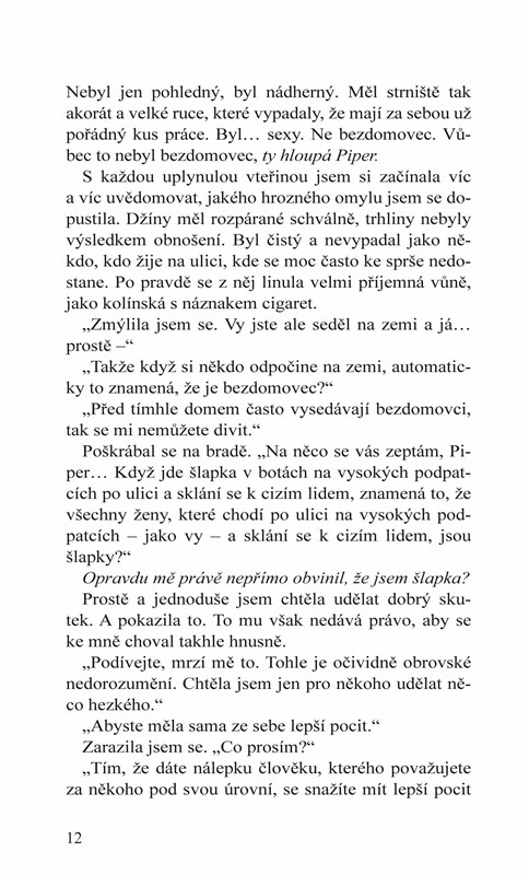 Některá z nás si přeje pod stromeček nové brýle, protože si omylem spletla nádherného muže s bezdomovcem… Jiná si chce polibkem cizího muže dokázat, že má stále smysl pro dobrodružství. A vyhnout se o svátcích protivům? To si snad přejeme všechny! Na druhou stranu, i z bručounů se můžou stát naše spřízněné duše. A když se přece jen zdá kouzlo Vánoc ztracené, nezapomínejme na vánoční večírky. Tam se teprve dějí věci…