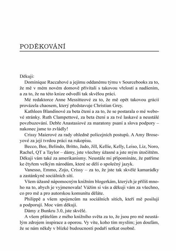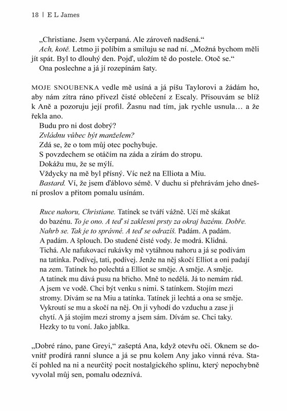 E L James se vrací do světa Padesáti odstínů v hlubším a temnějším pohledu na milostný příběh, který okouzlil miliony čtenářů celého světa. Jste srdečně zváni na svatbu desetiletí, kde Christian Grey učiní z Anastasie Steeleové svou manželku. Ale je vůbec Christian schopen obstát v roli nastávajícího manžela? Jeho otec má jisté pochybnosti, jeho bratr chce uspořádat divokou rozlučku se svobodou a jeho snoubenka nechce složit manželský slib poslušnosti. I samotné manželství však přináší jisté výzvy. Vzájemná vášeň Christiana a Any je žhavější a smyslnější než kdy dříve, ale Anin svobodomyslný vzdor nepřestává vyvolávat Christianovy nejtemnější obavy a zpochybňuje jeho vůli vzdát se kontroly. Jejich vztah také ohrožuje stará rivalita a zášť, a jedno nesprávné rozhodnutí by je mohlo navždy rozdělit… Dokáže Christian překonat noční můry dětství, vyrovnat se s trýznivým mládím a zachránit se? Teď, když konečně zjišťuje pravdu o svém původu, bude schopen najít sílu k odpuštění a přijmout Aninu bezpodmínečnou lásku?