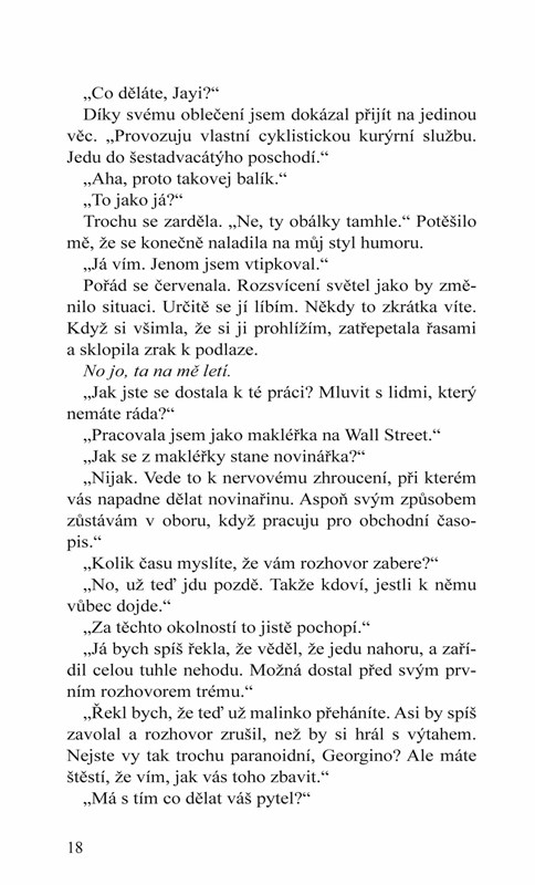 Bianca mi řekla, jak moc nemá ráda lidi Dexova typu – snobské, přechytralé, nažehlené muže, kteří nedokáží ocenit ty nejjednodušší věci v životě. Takže když se výtah konečně rozjel, zrušil jsem rozhovor a zanechal ji v domnění, že jsem někdo úplně jiný – kurýr jménem Jay, co jezdí na kole. Líbilo se mi, jak se dívala na toho chlapíka, a nechtěl jsem, aby to skončilo. Začal jsem s ní chodit jako „Jay“ – a její rozhovor s mým skutečným já s ní vyřídil po e-mailu. Nečekal jsem, že naše vzájemné jiskření bude stejně silné i přes internet. Nečekal jsem, že z toho vzejde takový blázinec. Nečekal jsem, že Jay a Dex se do ní zamilují. A že ona se zamiluje do těch dvou. Až na to, že oba muži jsem byl já. A když to zjistila, oběma nám hrozilo, že ji ztratíme. Na ten den mě nemohlo nic připravit. A já jsem nebyl ani zdaleka připravený na to, co přišlo potom.