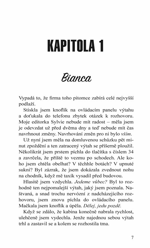 S Biancou jsem se potkal ve výtahu. Když jsme uvízli, jela se mnou pořídit rozhovor. Kvůli mému oblečení mě krásná novinářka s havraními vlasy považovala za poslíčka. Neměla ani ponětí, že ve skutečnosti jsem Dex Truitt, bohatý, úspěšný obchodník, jehož pojmenovala „Pan Pracháč“ a s nímž měla provést interview.