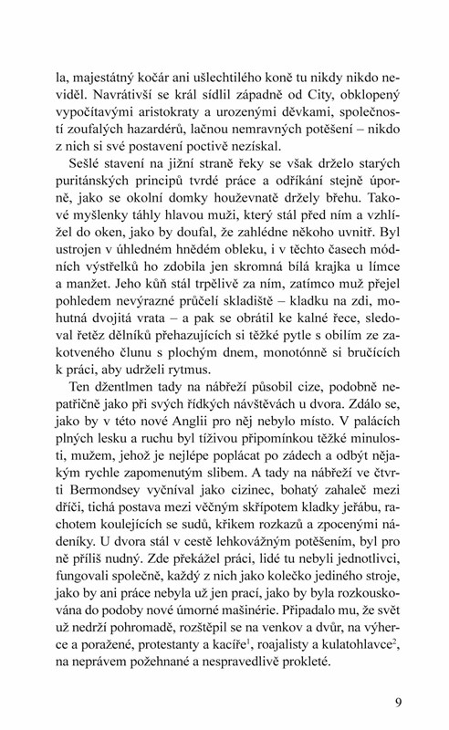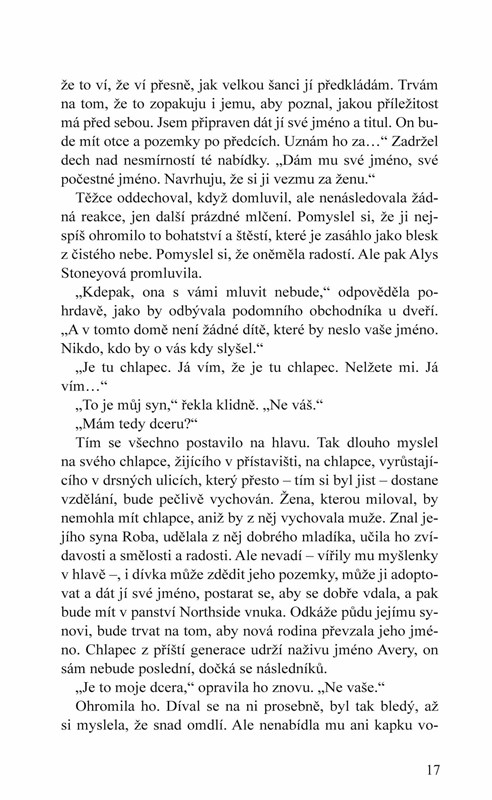 Do zchátralého londýnského skladiště na jižním břehu Temže dorazí dva nečekaní návštěvníci. První z nich je bohatý muž z Yorkshiru, pátrající po milence, již před jednadvaceti lety opustil. James Avery má dnes vše: peníze, pozemky, ba i královu přízeň. Chybí mu jen jedno, a o to teď žádá Alinor, majitelku nuzného skladiště – o dítě, které s ní kdysi zplodil.