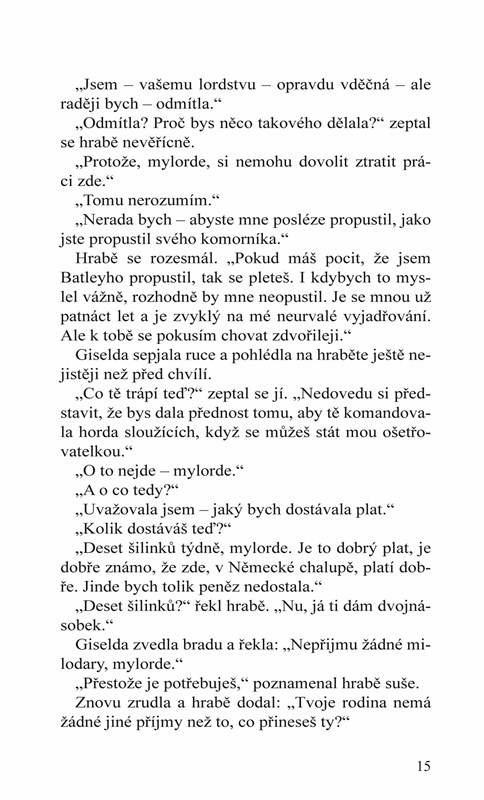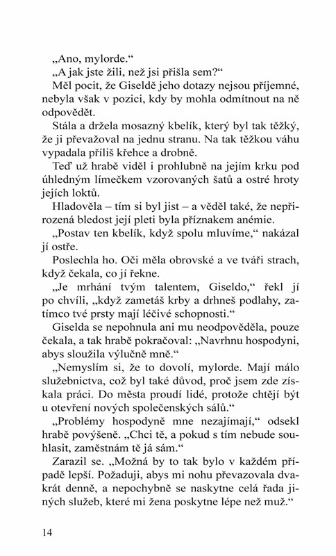 Potlačí všechnu svou hrdost a osloví svého bohatého zaměstnavatele, pohledného hraběte z Lyndhurstu, který se zotavuje ze zranění utrpěného v bitvě u Waterloo. Ten se však rozhodne, že najde způsob, jak jí pomoci, aniž by urazil její důstojnost. Když zjistí, že dívka má obratné ruce a skvělé ošetřovatelské schopnosti, zaměstná ji jako svou soukromou ošetřovatelku. Kdo však Giselda doopravdy je a proč tak nerada mluví o svém soukromí? Dokáže si uchovat svou čistotu pro toho, koho bude opravdu milovat? A podaří se hraběti uniknout ze spárů zlosyna, jenž usiluje o jeho majetek?