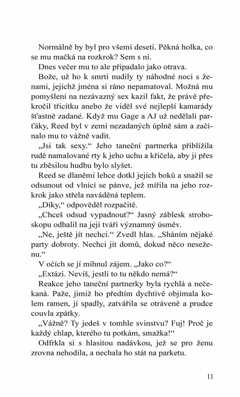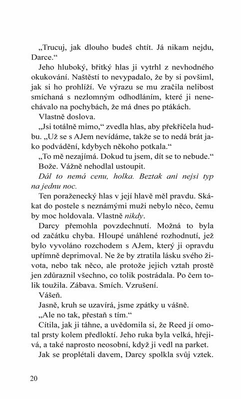 „Ještě nikdy se necítila se špatným mužem tak báječně… Bývalý zápasník Reed Miller celé měsíce tajně touží po dívce svého nejlepšího přítele, ale odmítá ohrozit přátelství kvůli ženě – především ne kvůli takové, která ho nemá zrovna dvakrát v lásce. Teď když je Darcy znovu volná, je o to víc třeba držet se od ní dál. Jenže mezi nimi panuje silná přitažlivost, kterou je obtížné ignorovat, a jakmile dostal jednou šanci ochutnat… kdo ví, co bude dál. Darcy Grantovou už nebaví chovat se slušně a počestně. Hledá vášeň a není pochyb, že Reed je muž, který jí přesně tohle poskytne. Ačkoliv nemá zájem s takovým typem muže chodit, a už vůbec ne, když je to nejlepší kamarád jejího ex, nemůže si pomoct, aby nepodlehla Reedovým zkušeným dotykům. Teď jde jenom o to stanovit základní pravidla – a doufat, že se jich ten drsňák, co pravidla rád porušuje, bude držet. Pokud ovšem pustí Reeda do svojí postele, má vůbec šanci nepustit si ho i do srdce?“
