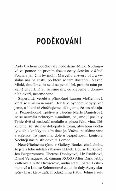 Marcello byl Muž s velkým M – ten, který odešel. A teď se její minulost střetává s přítomností, s přítomností, kde by měla truchlit nad zkázou svého manželství a – hele, ty fettuccine jsou strašně dobré! A Marcello taky. Avery si snadno zvykne na příjemný život v letním Římě, dny věnuje zkoumání města, nad nímž historici omdlévají blahem, a po nocích omdlévá blahem nad svou nečekanou romancí v duchu co bylo staré, je zase nové. Je to opojné, je to jako horečka, je to hříšné a je to šílené. Ale opravdu by to mohl být její nový život? Nebo je to jen dočasný únik před návratem do země twinsetů a sendvičů bez kůrky?