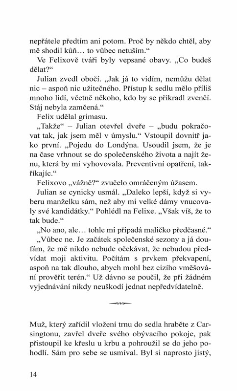 Julian na Melissu nikdy nezapomněl. Když teď zdědil hraběcí titul, musí se oženit a je odhodlaný vybrat si nevěstu sám. Domníval se, že touhle dobou už bude Melissa vdaná za jiného, ale zřejmě tomu tak není. V důsledku toho nemá nic proti tomu, kam ho zřejmě Osud vede.