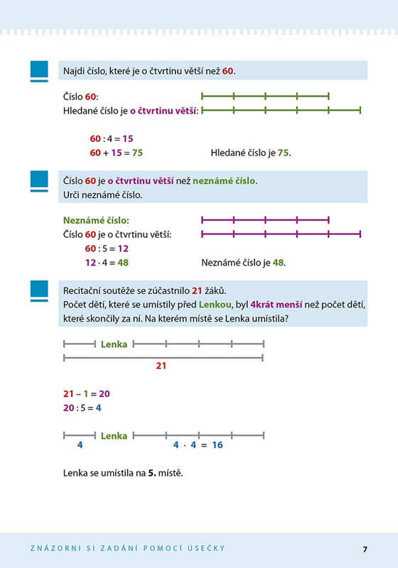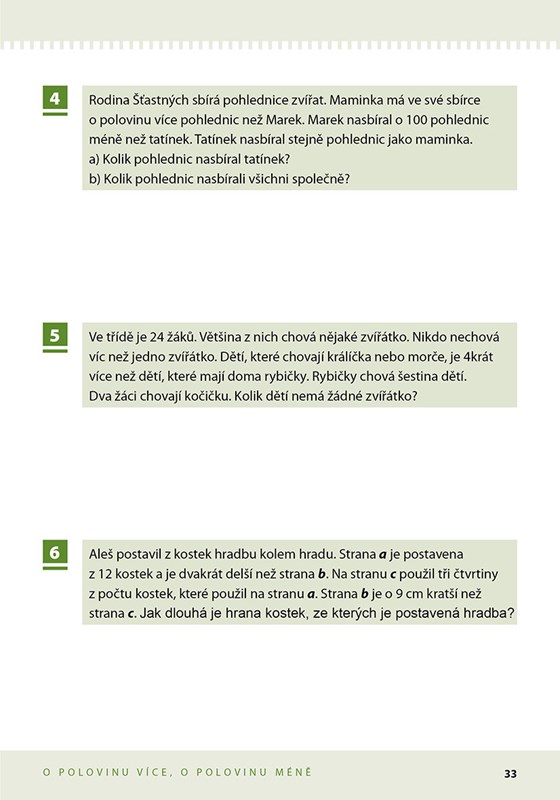 Kniha je rozčleněna do kapitol, které obsahují obdobné typy úloh různé obtížnosti. V každé kapitole najdeme ukázky možného řešení. Po ukázce následuje zadání příkladů, které řeší obdobnou problematiku a jsou vhodné jak k individuální, tak společné práci. Dítě si může volit vlastní postupy. Kapitoly jsou doplněny názornými myšlenkovými mapkami pro ujasnění souvislostí a utřídění informací. Nechybí řešení úloh, ani stručná shrnutí, jak k danému typu úloh přistupovat.