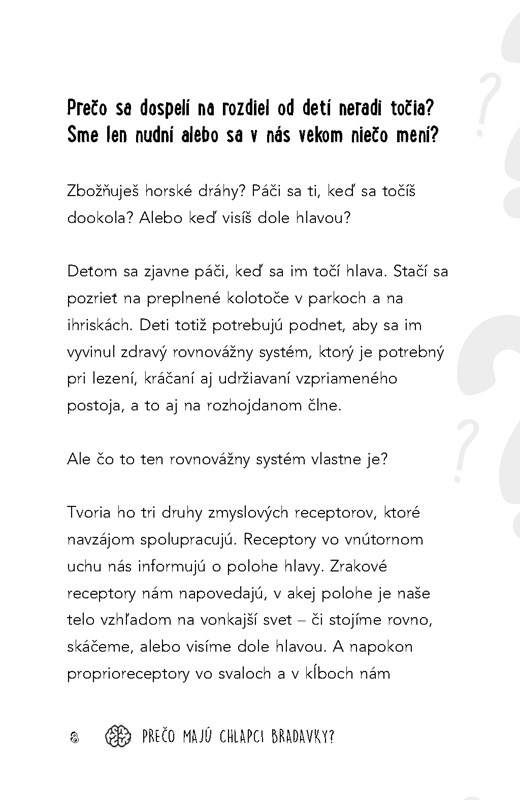 Otázky sú tematicky rozdelené (naše telo, zvieratá, jedlo, vesmír) a sú prekladané pokusmi, ktoré si môžet...