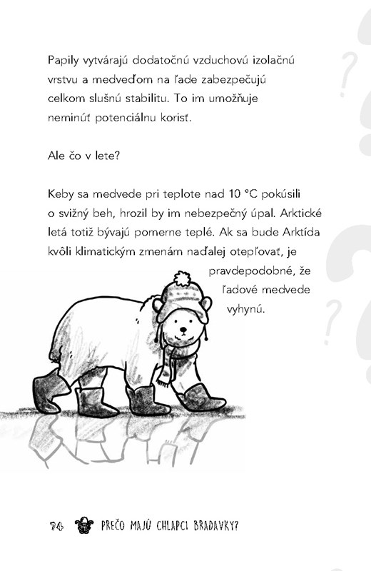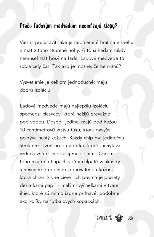 Viete, prečo sa zbierajú veľrybie sople? Ako je možné, že Eskimáci nemajú skorbut aj keď nejedia žiadne ovocie a zeleninu? Prečo majú tigre pruhy a nie napríklad škvrny? Prečo robíme grimasy, keď jeme kyslé jedlo? Či Armstrong naozaj bol na tom Mesiaci? Ako dlho by trvalo, kým by sme všetci zamrzli, keby zrazu prestalo svietiť Slnko?