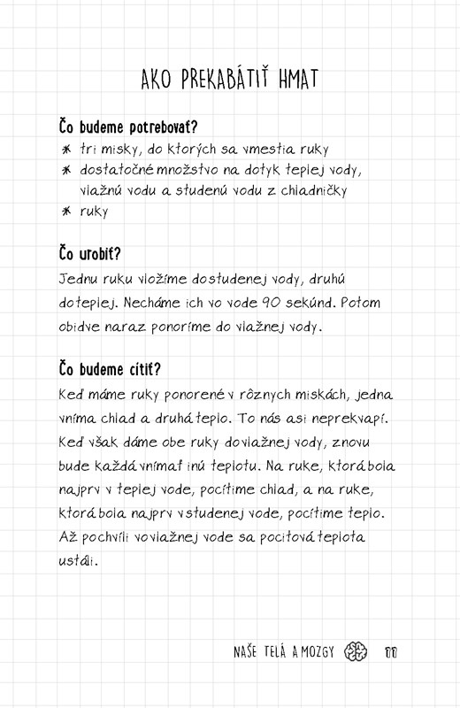 Otázky sú tematicky rozdelené (naše telo, zvieratá, jedlo, vesmír) a sú prekladané pokusmi, ktoré si môžete doma urobiť. Niektoré ľahko (stačí voda alebo hruška a jablko), iné sú na vstupný materiál náročnejšie.
