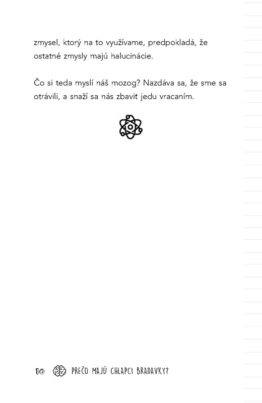 Úplne najviac sa mi páči, ako kniha zdôrazňuje funkciu vedy a vedecké postupy, ktoré nám pomáhajú všetky tieto veci pochopiť. Niektoré vysvetlenia sú trochu komplikovanejšie a používajú sa tu odborné termíny, takže knižka je sice od 8 rokov, ale možno pre menej zdatných čitateľov niektoré otázky budú príliš náročné.