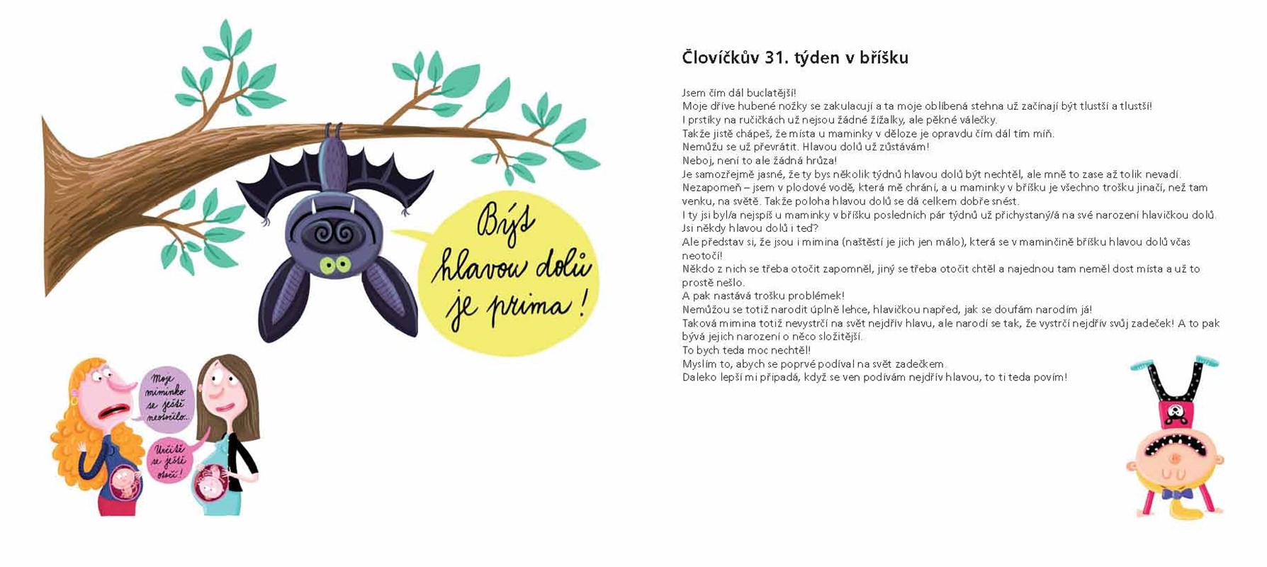 Věděli jste, jak miminko prožívá dobu před svým narozením? Kdy malému človíčkovi v maminčině břiše začínají růst nehty? Kdy si už dokáže cucat palec? Nebo jak čůrá? To všechno, a ještě mnohem víc vám ve 42 kapitolách, odstupňovaných podle týdnů těhotenství, poví ta nejpovolanější osoba. Samotné miminko v děloze. A věřte, že se nebudete ani chvilku nudit! Veselé ilustrace Anety Žabkové pobaví děti i rodiče.