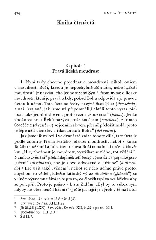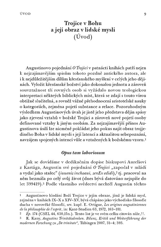 V rozsáhlém díle nejvlivnějšího z latinských církevních otců, Aurelia Augustina, zaujímá spis O Trojici (De Trinitate) výjimečné postavení. Dotýká se samotné ústřední nauky křesťanské teologie a svým významem patří k nejdůležitějším díkům křesťanského myšlení v celých jeho dějinách. Augustin přirovnává trojjediného Boha křesťanské víry k lidské mysli s jejími třemi základními mohutnostmi: pamětí, intelektuálním nahlížením a vůlí (láskou). Trojice se zrcadlí v lidské mysli, tak jako je člověk sám Božím obrazem. Základním podobenstvím Trojice je láska. Zasvěcený úvod přední české znalkyně Augustinova díla a myšlení i patristické filosofie a teologie jako celku Lenky Karfíkové vztahuje Augustinovo mnohovrstevnaté dílo k antické filosofické tradici i soudobým dílům řeckých i latinských církevních otců a přispívá tak k jeho hlubšímu porozumění.