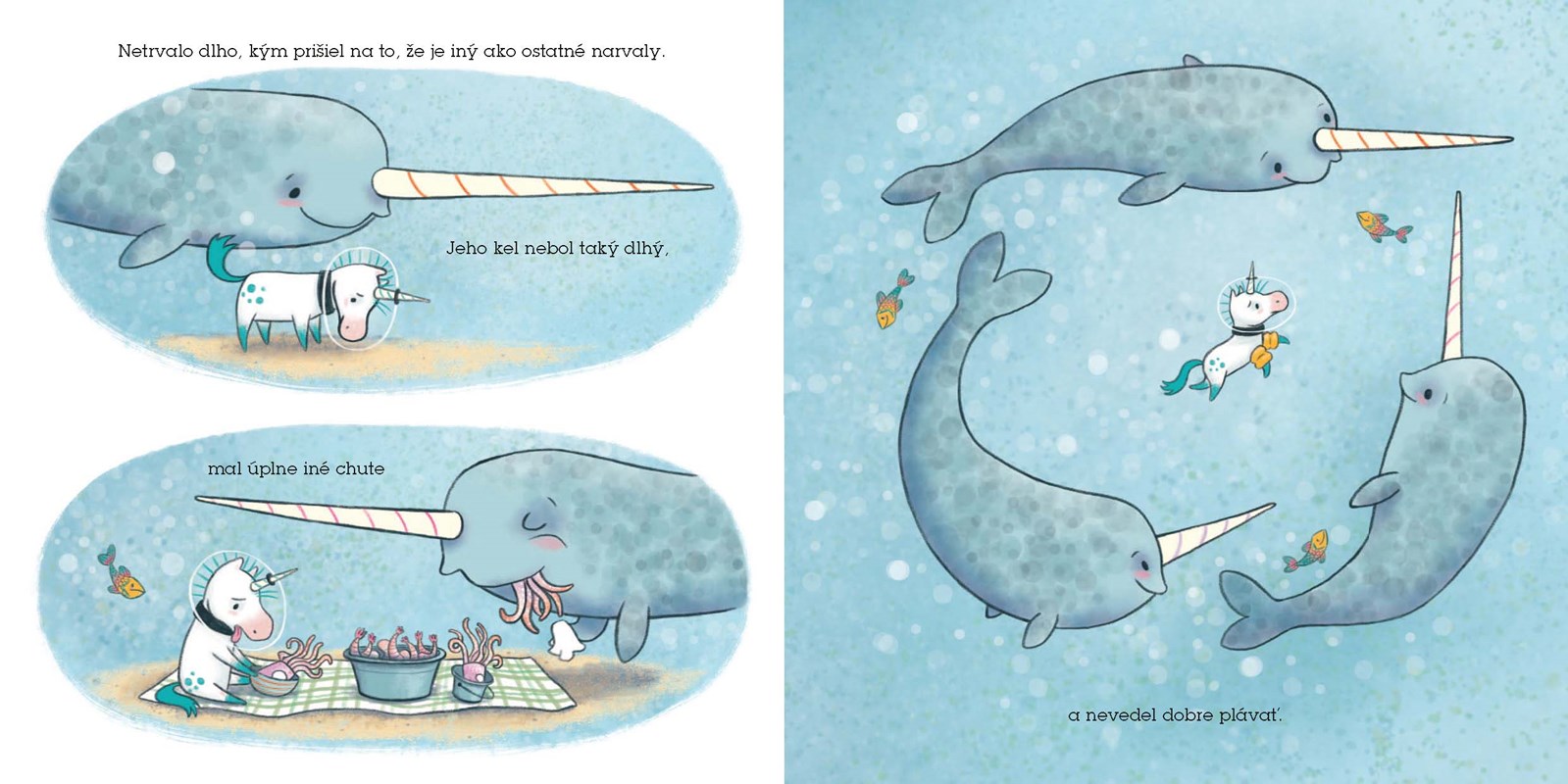 Malý Kelp je už od narodenia iný než ostatní narvalovia, no všetci si už na to dávno zvykli. Nepláva tak rýchlo ako oni, dokonca ani plody mora mu príliš nechutia. Raz v noci však Kelp uvidí záhadné stvorenie, ktoré vyzerá presne ako on! Takže ako je to v skutočnosti? Kelp nie je narval, ale jednorožec? A kam teda naozaj patrí – do hlbín oceánu alebo k svojim novým priateľom na súši?
