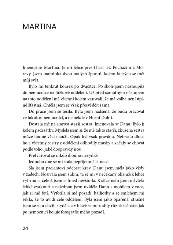 Kniha je jakousi zpovědnicí zdravotních sester, které si prošly nebo procházejí šikanou na pracovišti. Na místě, kde tráví nejvíce času. Na místě, kde se léčí a uzdravuje. Za zavřenými dveřmi se kromě léčebných procesů odehrávají ještě další příběhy. Kniha mapuje osudy žen, které se ocitly v nepříjemných situacích a některým z nich chování kolegyň zapříčinilo vznik vážných onemocnění. Nejenže si prošly složitým dětstvím, ale ani v pracovním životě na ně nečekalo zrovna příjemné přivítání.