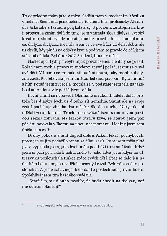 „Jedeme na sál. Cítím, jaká je mi na pojízdné posteli jen v andělíčku zima. Klepu se. Imunitu mi příslušnou medikací stáhli skoro k nule, aby moje tělo bylo ochotné nové orgány přijmout. Nemám strach. Je to jakýsi druh adrenalinu, mlha v hlavě, gumové vystresované tělo. Podobá se to pocitu, když jsem jako dítě startovala na závodech ve sprintu. Zaklekám do bloku. Tretry potřebovat nebudu.“