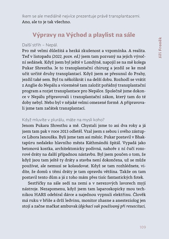Novinářka Renata Kalenská v roce 2018 podstoupila transplantaci ledviny a slinivky. Za záchranu svého života vděčí špičkovému transplantačnímu týmu z pražské nemocnice IKEM, který vede přednosta Jiří Froněk. O jejich práci se však rozhodla vyprávět už o něco dříve, když měla možnost sledovat Froňka při operaci na sále a viděla, s jakým zápalem chirurgii provádí. Vedla s ním proto obsáhlý rozhovor a mluvila také s řadou pacientů po transplantaci, jejichž příběhy jsou jen stěží uvěřitelné.