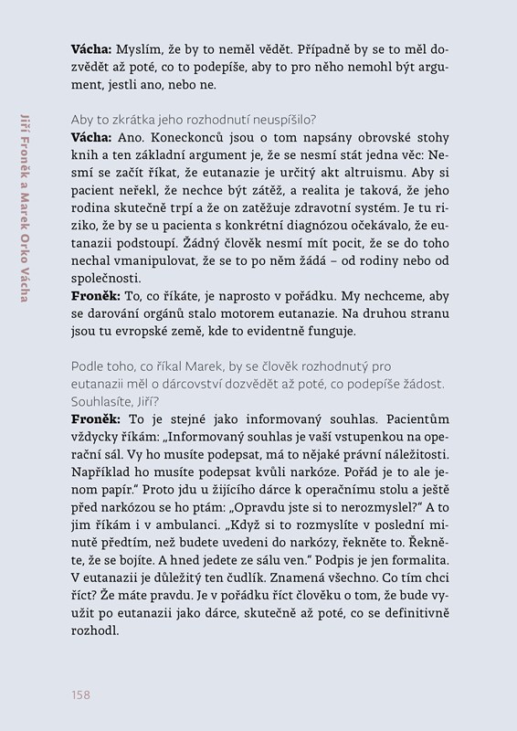 Rozhovory s Jiřím Froňkem a pacienty doplňují kněz a lékařský etik Marek Orko Vácha a psychiatr Radkin Honzák.